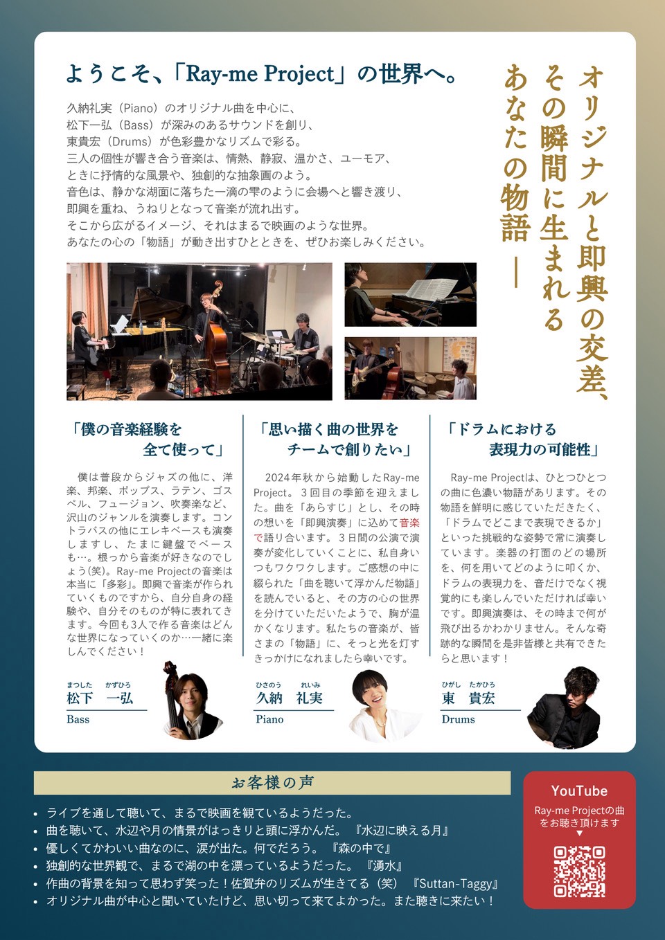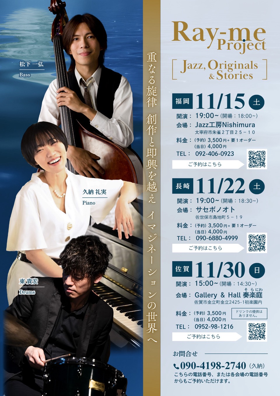 久納礼実 (Piano) のオリジナル曲を中心に、松下一弘 (Bass) が深みのあるサウンドを創り、東貴宏 (Drums) が色彩豊かなリズムで彩る。